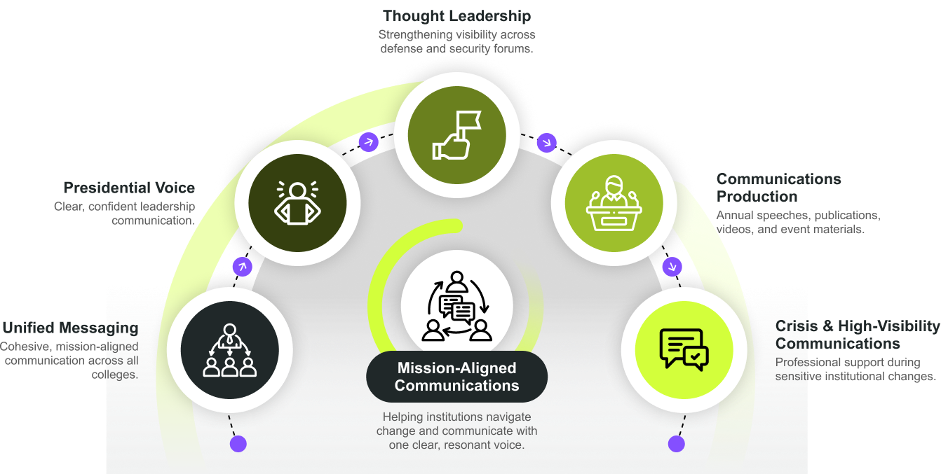 To meet these needs, OTOT provided strategic communications support to the NDU president and senior leadership. Our approach focuses on five key areas: