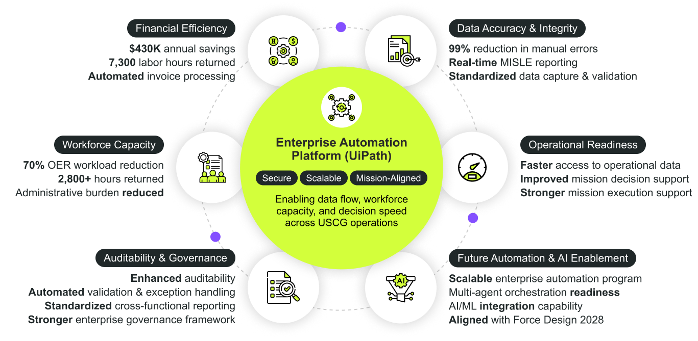 The US Coast Guard (USCG) required scalable, secure automation capabilities to reduce manual workload, eliminate process bottlenecks, and increase mission readiness by accelerating key finance, personnel, and operational data processes.